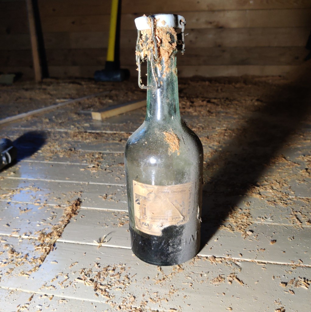 – vanhoja lasisia pulloja, joissa kryptisiä litkuja