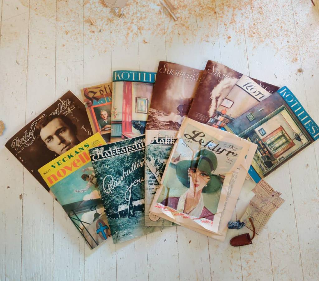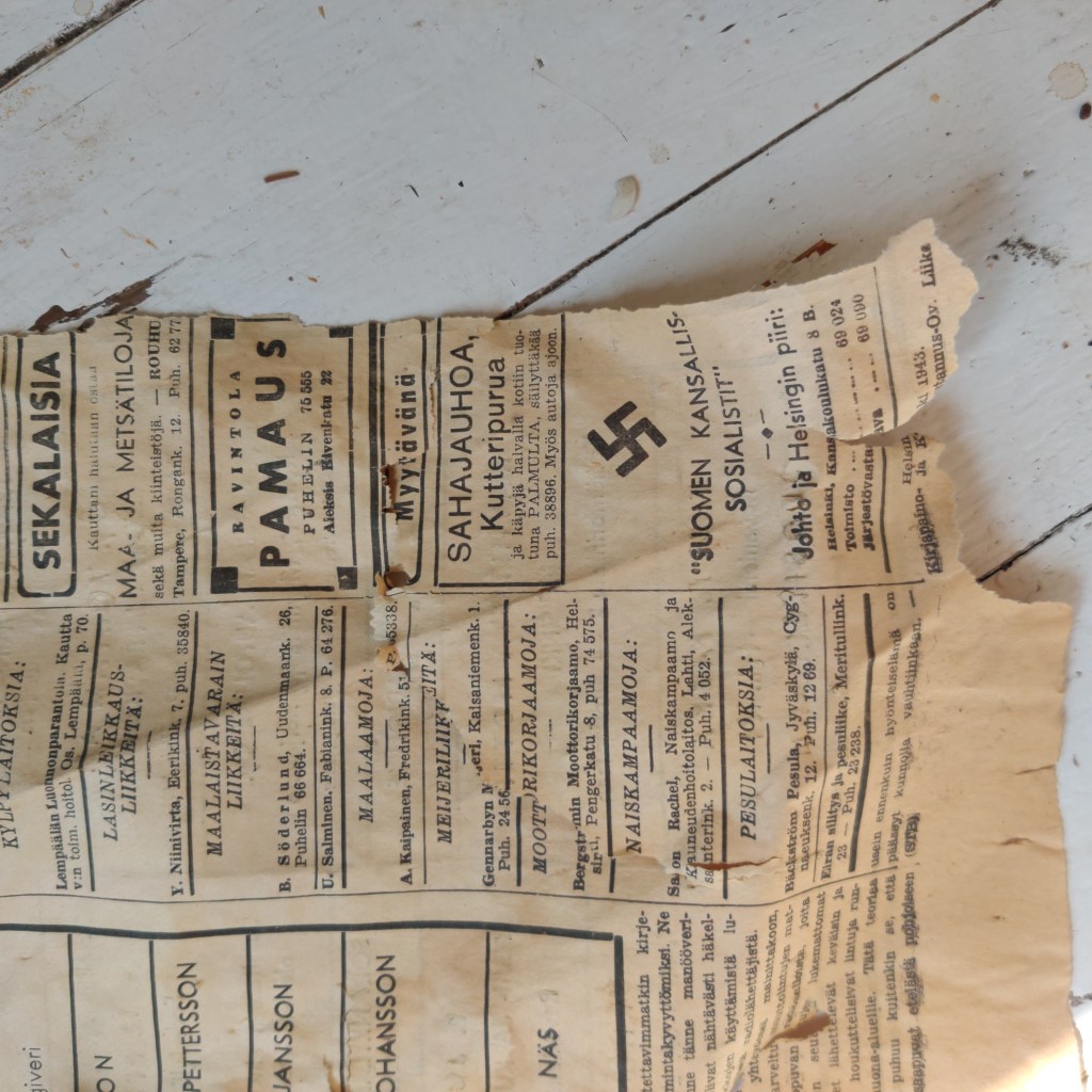 Meille ilmoitettiin, että talo on rakennettu 30-luvun alkupuolella. Tarkkaa tietoa ei ollut. Siihen aikaan talon valmistuminen ja siihen liittyvä ilmoittelu ei välttämättä ollut synkroonissa. Sittemmin on löydetty eristepurujen peitteenä olleita 1932 päivättyjä Hesareita ja Höbliä. Lehtien sisältö on yllättävän sukulainen nykyajan kanssa.