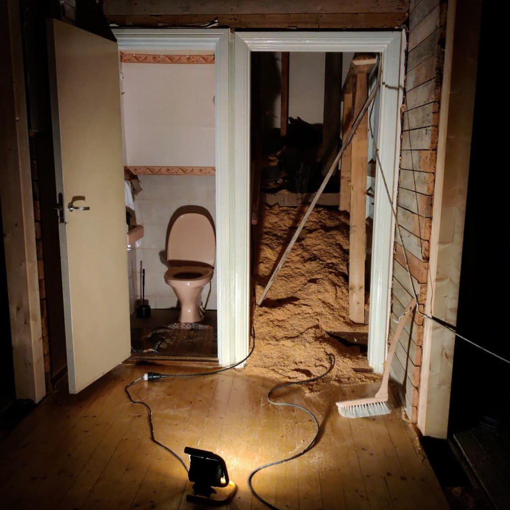 On kiinnostavaa, että talo on edelleen eristetty kokonaan sahanpuruilla. Jotenkin se toimii edelleen, koska lämmityskulumme ovat vanhalle talolle ihan säädylliset. Nyt, kun on purettava kaikenlaista, purut uhkaavat levitä sinne tänne. Ensi viikolla meillä on purun poisto talkoot, johon olemme vuokranneet imurin. Tarvitaan paljon pölynkestävää väkeä, lastenvahteja, ruokaa ja juomaa, sekä joku taju siitä, miten tämän perhaiten ja tehokkaimmin tekisi.