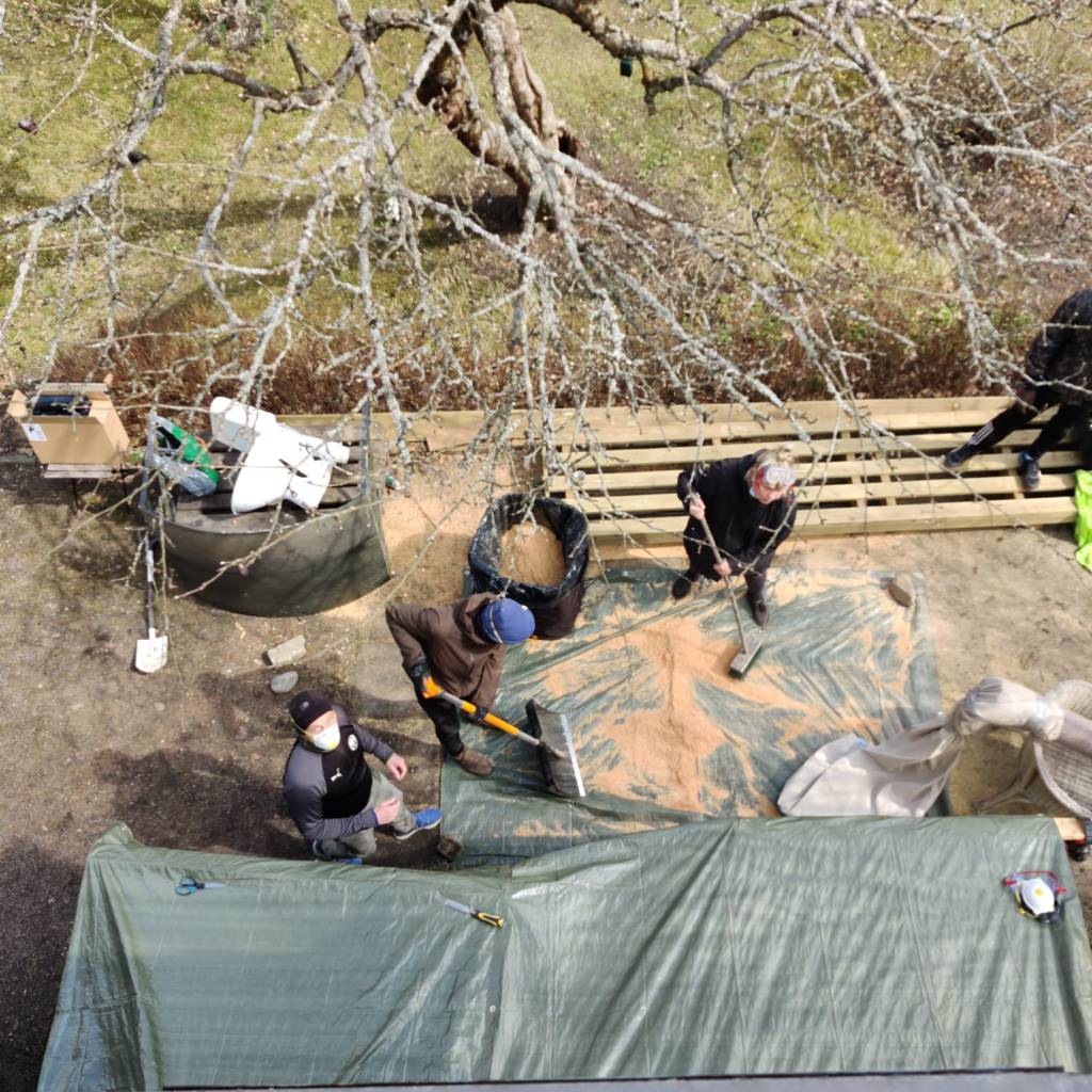 Saimme toukokuussa järjestettyä kivat talkoot, johon olimme vuokranneet suuren puru-imurin, jotta saisimme kätevästi impattua puruja uudelleen käytettäväksi. Meillä on hengittävä talo ja sen mukaisesti se pitäisi uudistaa. Oli purua ja pölyä, ruokaa ja juomaa ja tunnelma oli leppoisa.