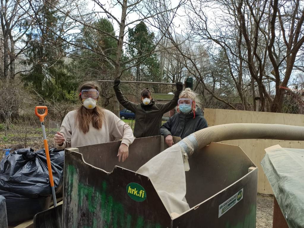 Puruimuri oli niin voimakas, että oli ongelmallista saada purut talteen niin, että ne eivät levinneet pitkin korttelia. Kokeilussa oli kangassäkit, siivilät ja monen moiset kaukalot. Päivän kehittelyn jälkeen loimme täydellisen keräyskaukalon, josta ilmapaine pääsi läpi ja purut jäivät.